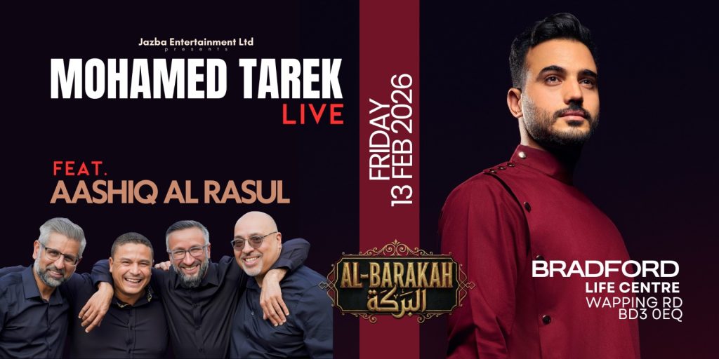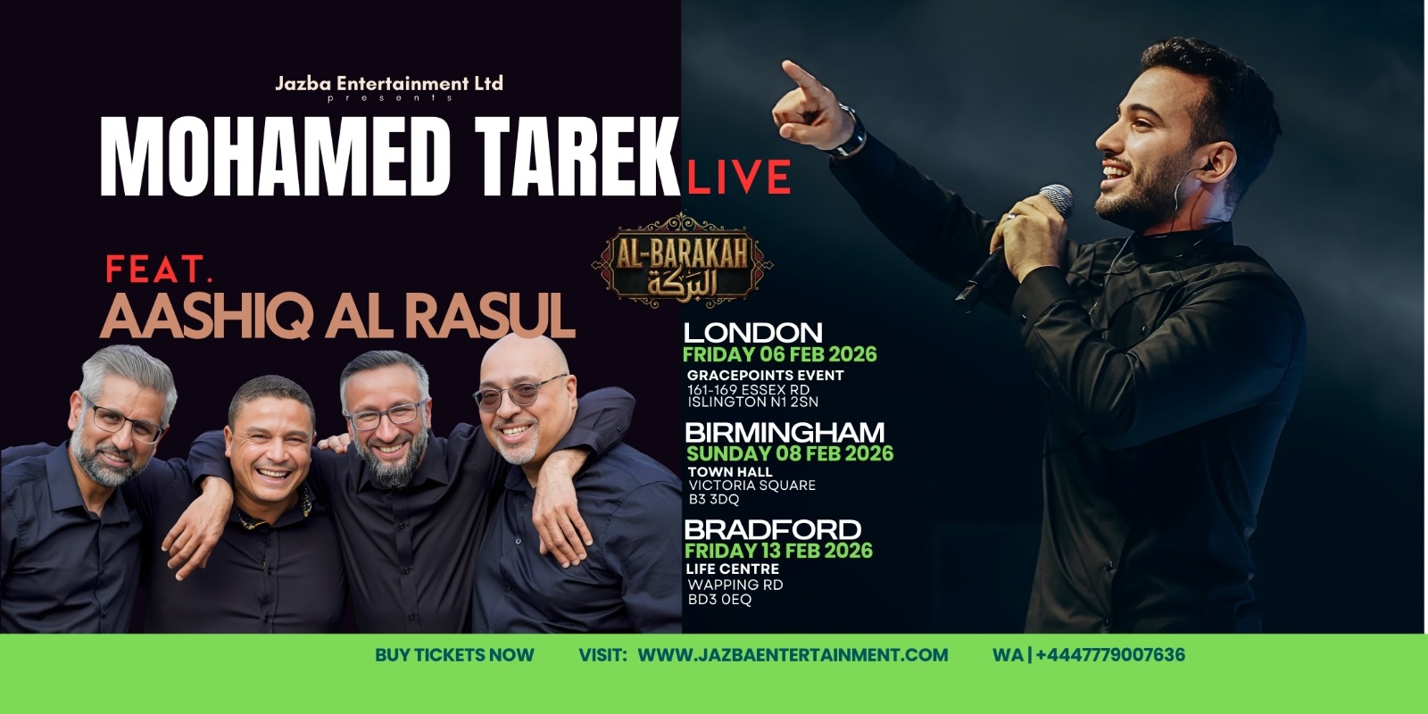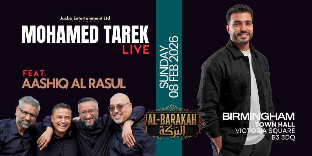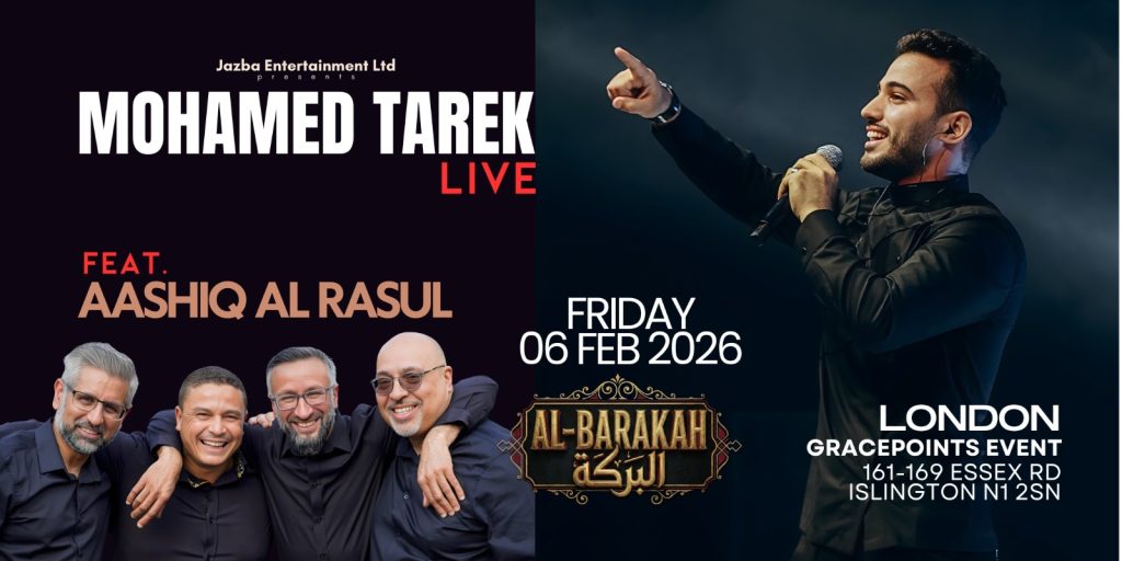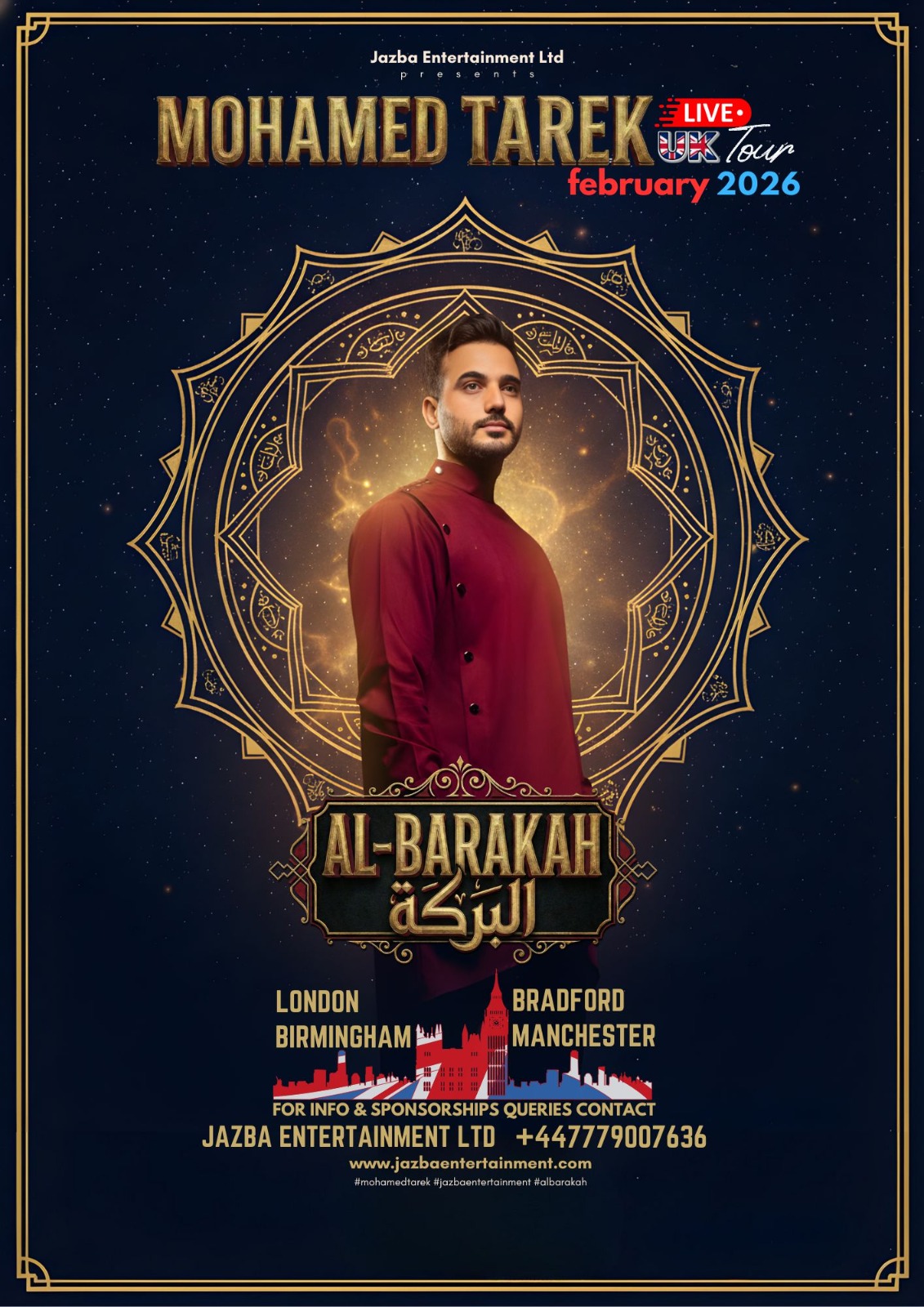 Prepare for an unforgettable spiritual journey as the world-renowned Mohamed Tarek brings his AL-BARAKAH — A Journey of Blessings & Melody tour to the United Kingdom in February 2026. This highly anticipated event promises a serene evening filled with profound devotional melodies and Nasheed, designed to uplift the soul and strengthen the heart. Accompanied by a full live band, Mohamed Tarek’s powerful and harmonious voice will create an atmosphere of peace and reflection that resonates long after the final note.
